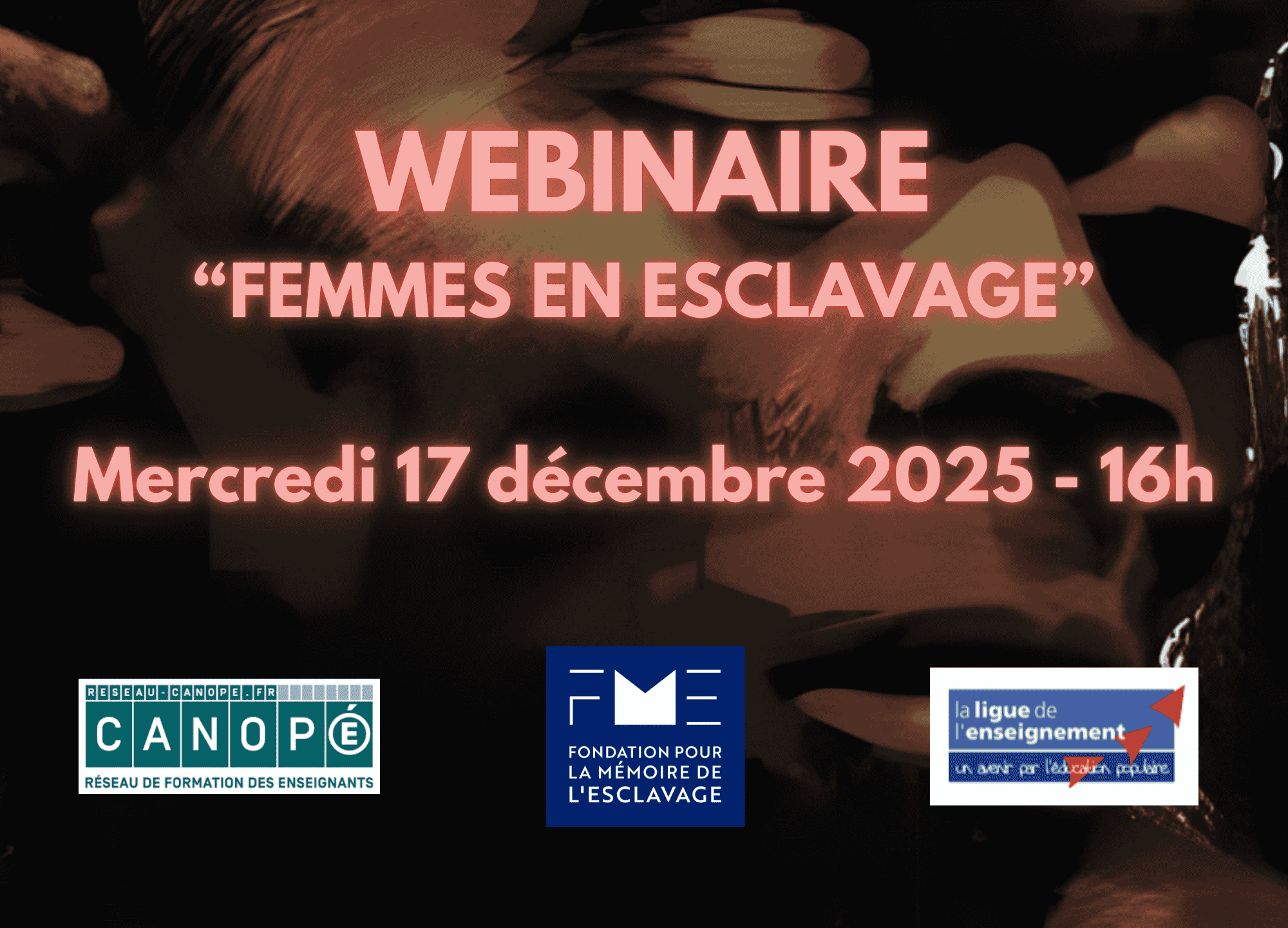 Alors que la fin du premier trimestre approche, nous vous proposons, en partenariat avec Canopé et la Fondation pour la mémoire de l'esclavage, un webinaire pour découvrir le concours et les ressources disponibles sur la thématique "Femmes en esclavage" :